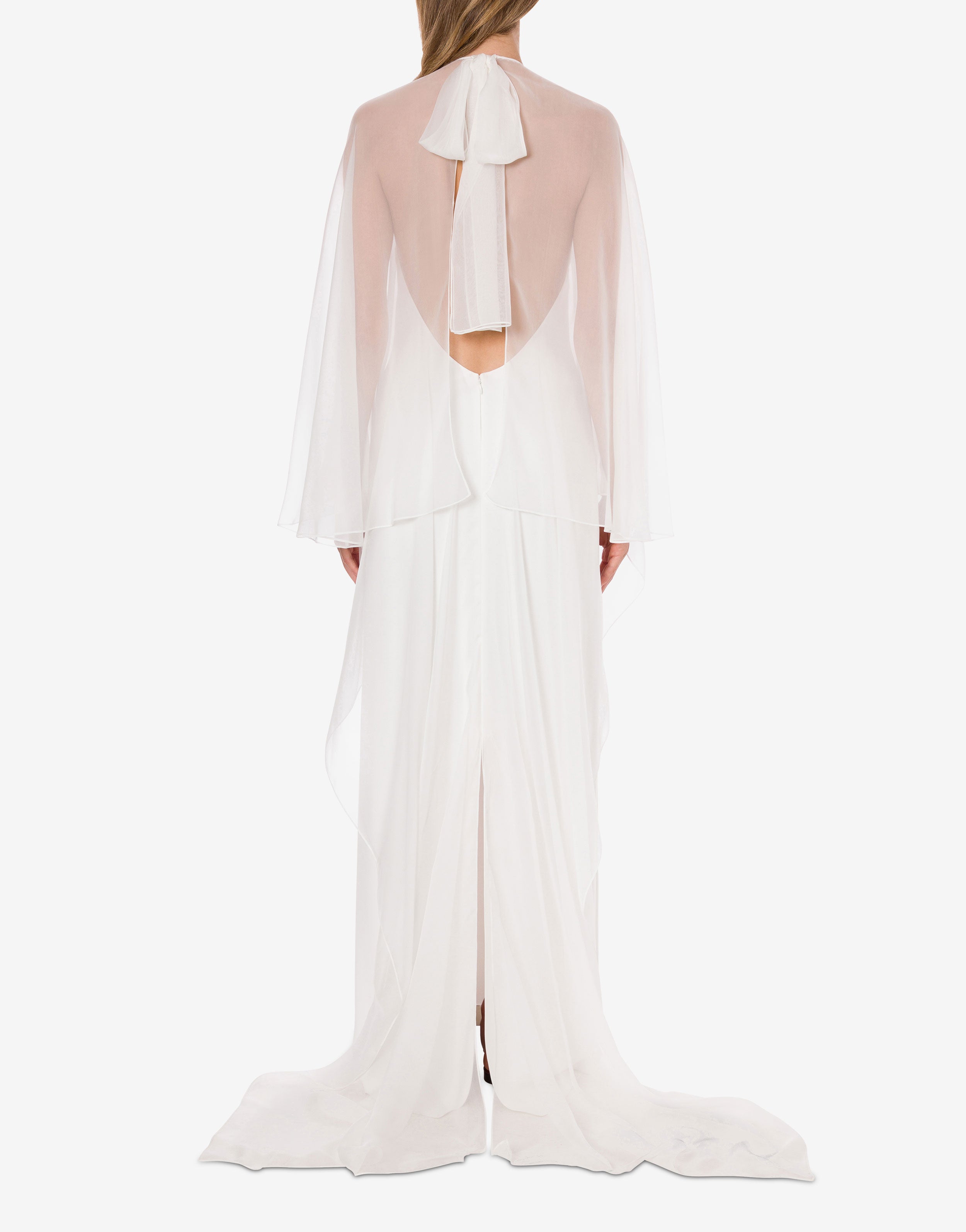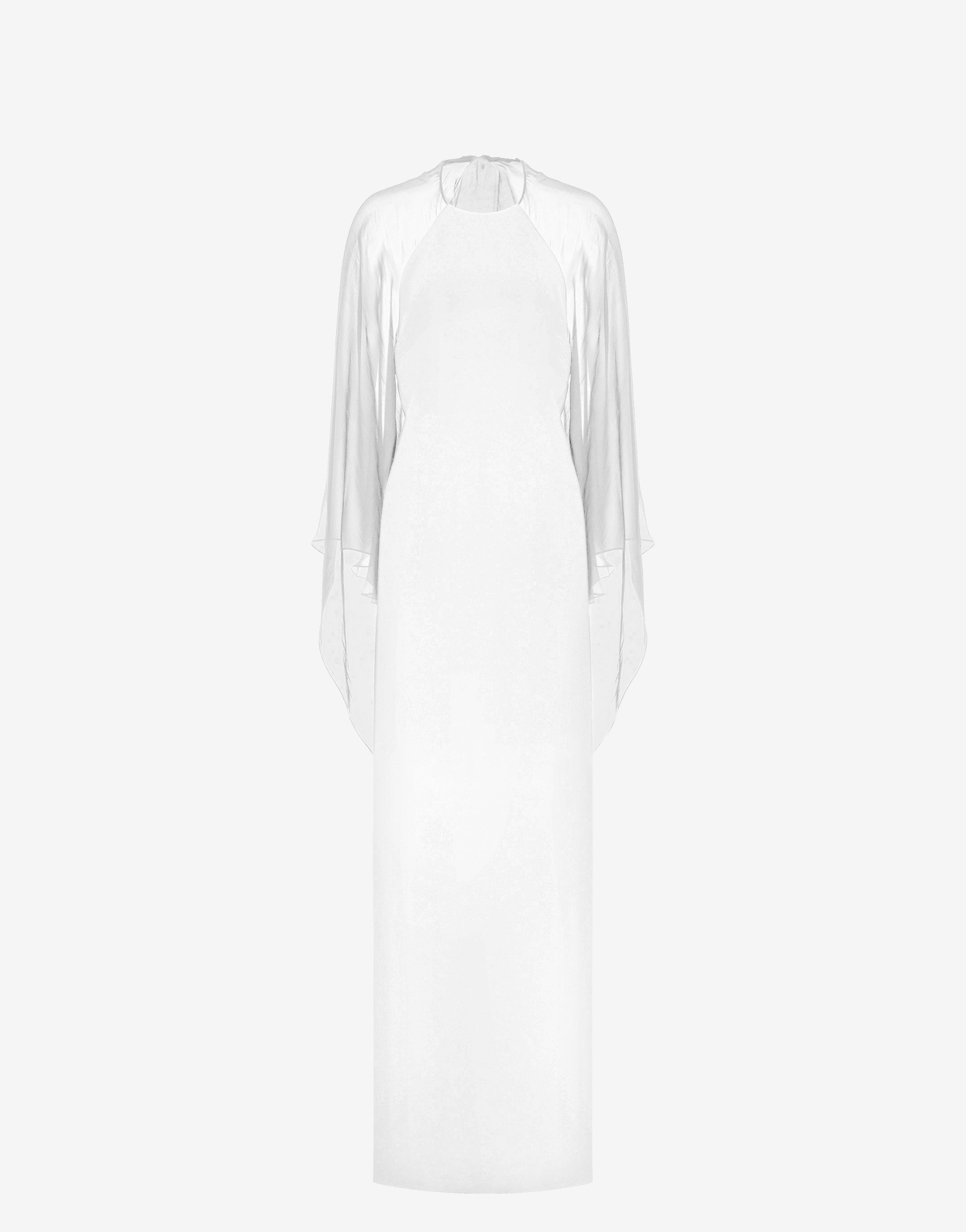 Elegante e sofisticato, questo lungo abito da sera nero ha la schiena scoperta. Le maniche in chiffon tagliate in sbieco aggiungono un tocco di romanticismo al corpo in cady stretch.