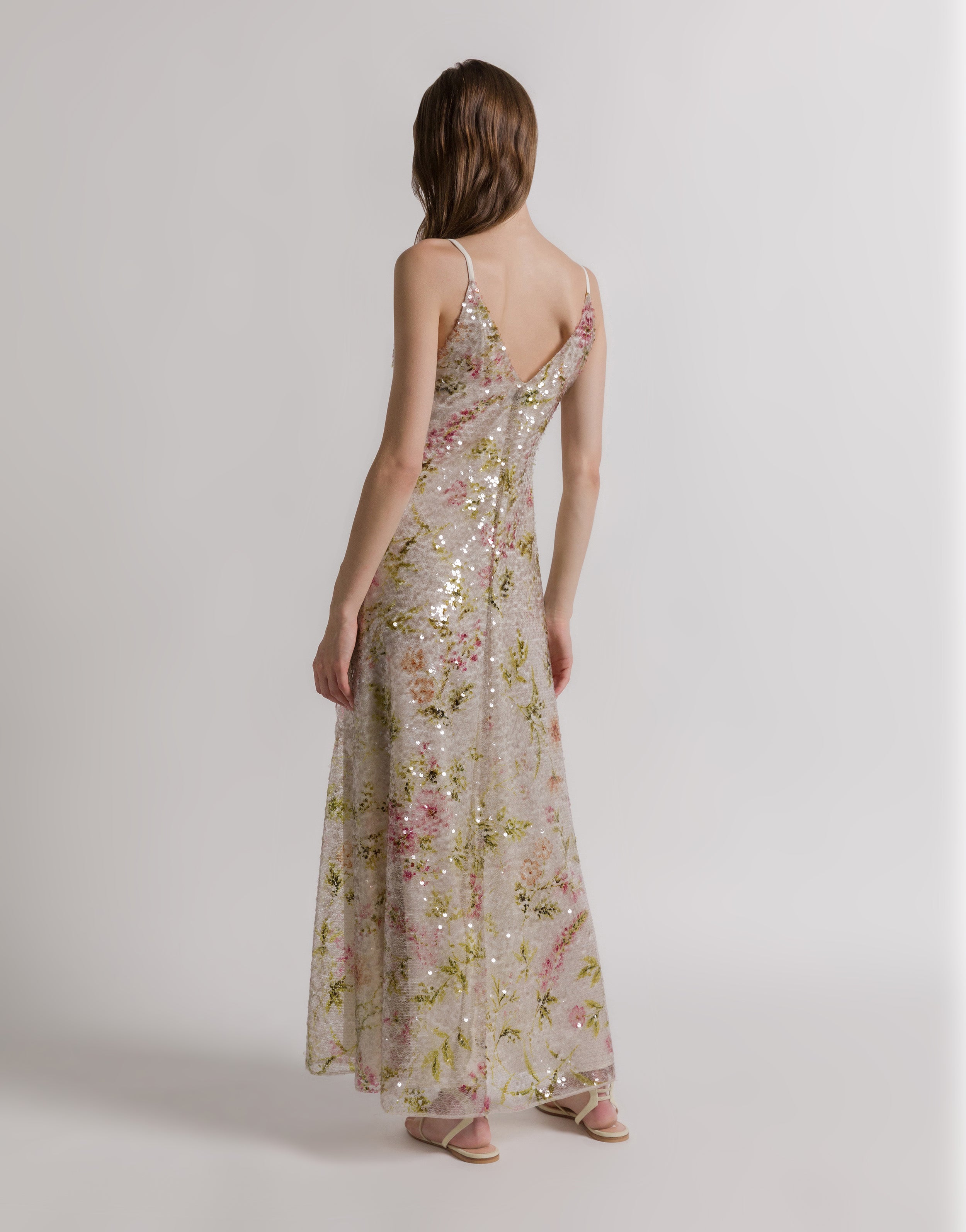 Femminile e romantico, questo abito da sera senza maniche è interamente ricoperto di paillettes stampate con un poetico motivo floreale, in linea con il tema botanico di questa stagione.