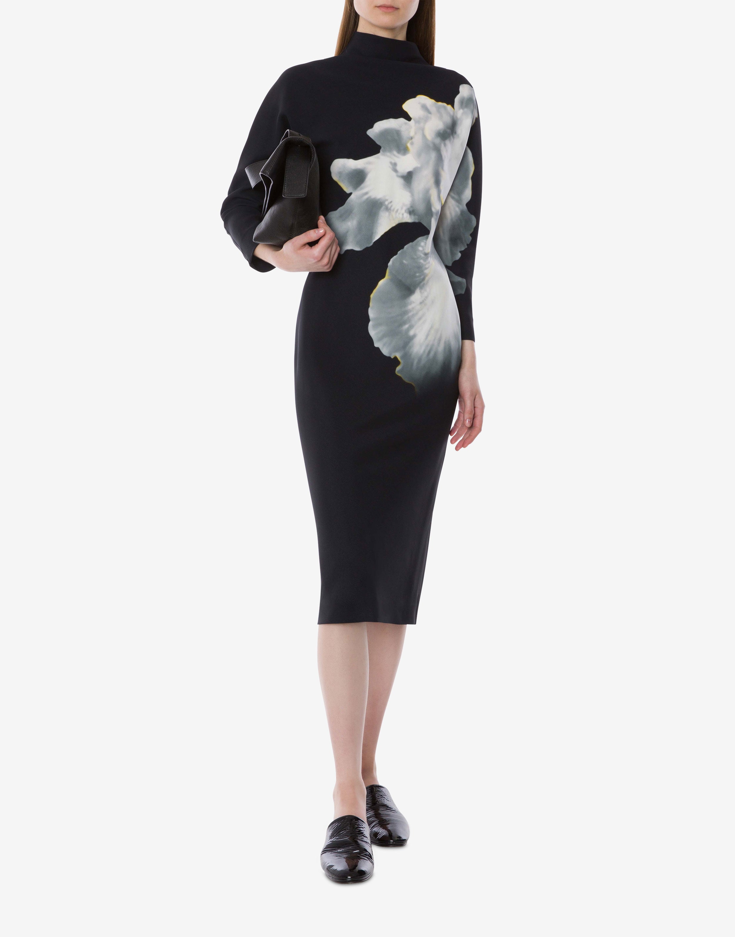 Il cady di viscosa diventa una tela per la stampa oversize di orchidee in bianco, che decora il corpo e le maniche di questo raffinato abito midi.