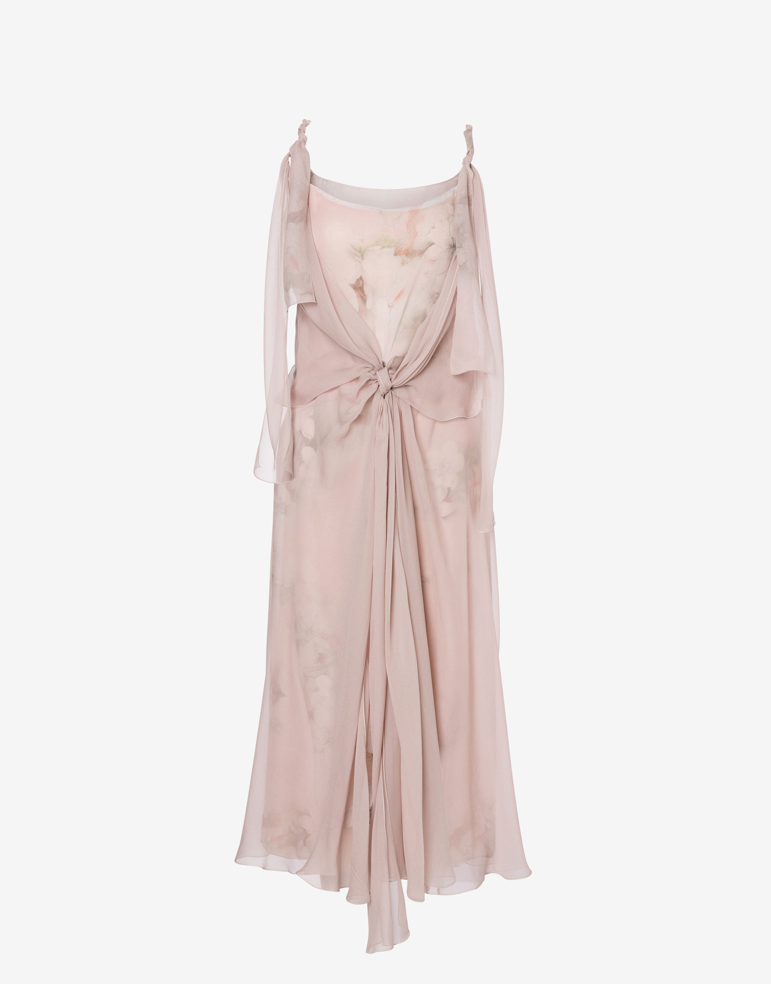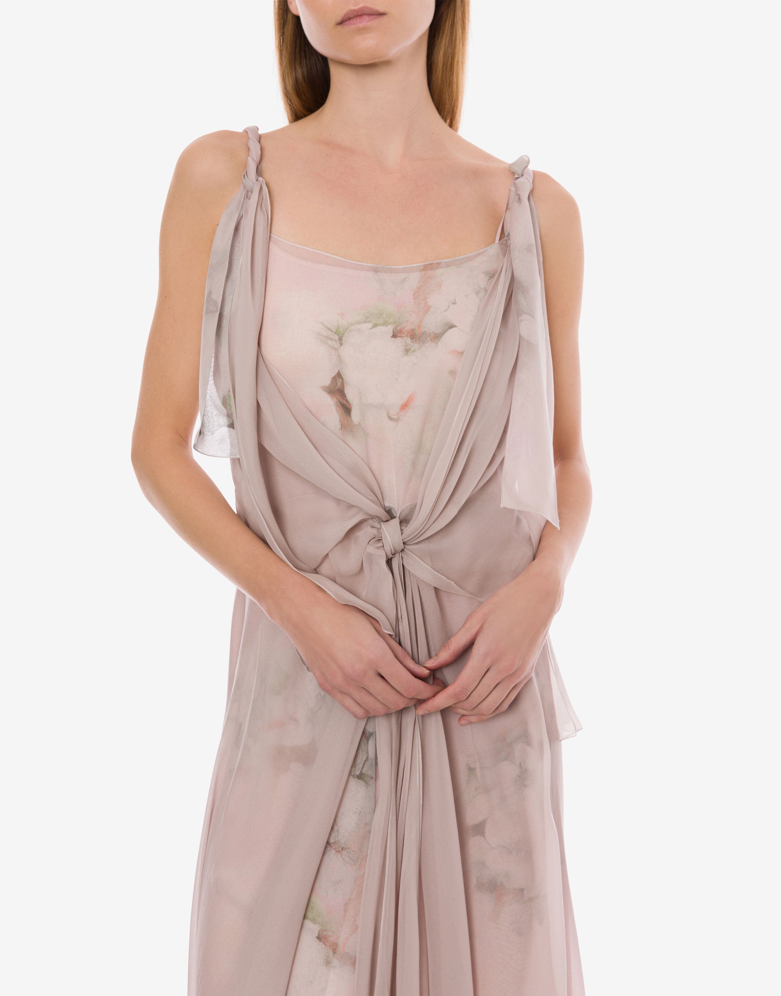 Abito morbido in chiffon leggero con stampa floreale. Un leggero nodo sul davanti scende a cascata, creando delicate arricciature lungo il tessuto.