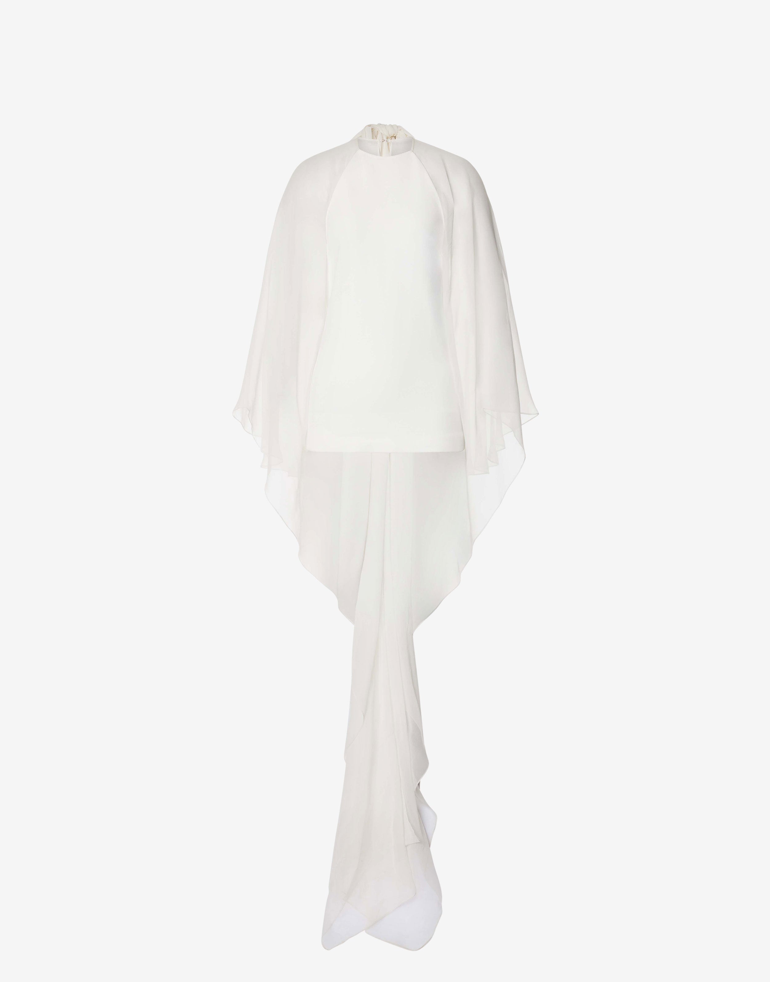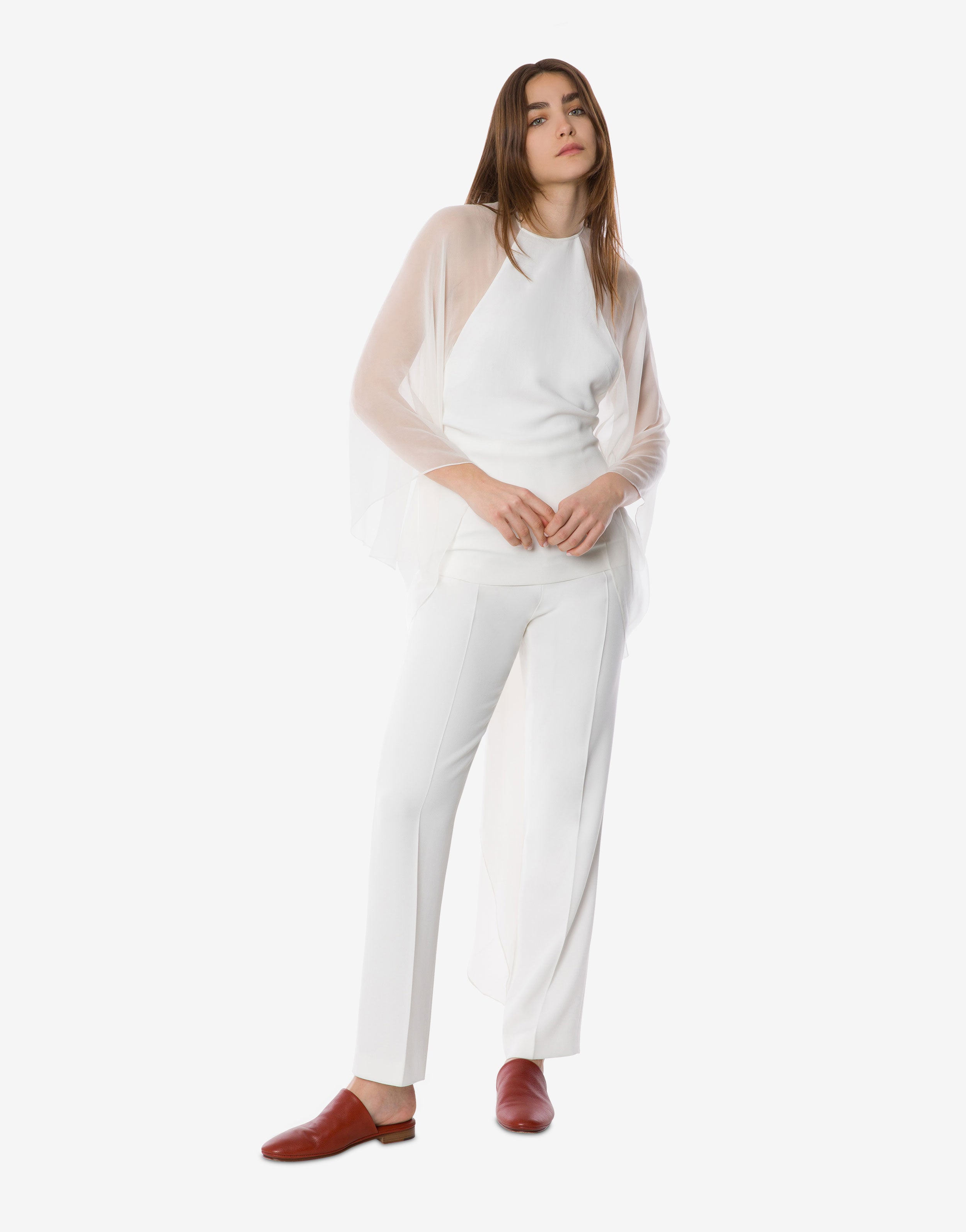 Una visione in bianco. Le maniche lunghe di questa blusa in cady stretch sono realizzate in chiffon leggero tagliato in sbieco, giocando con le trasparenze.