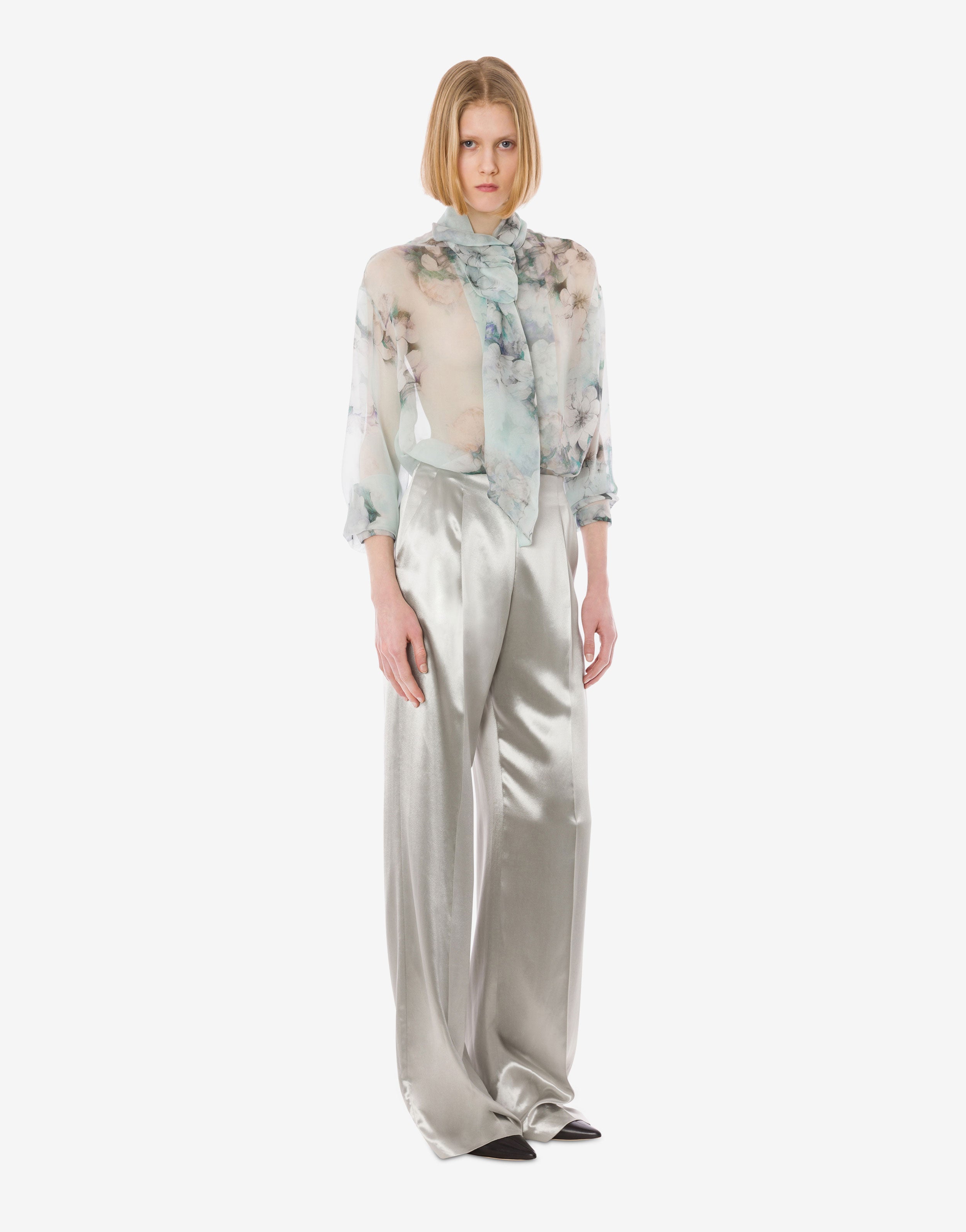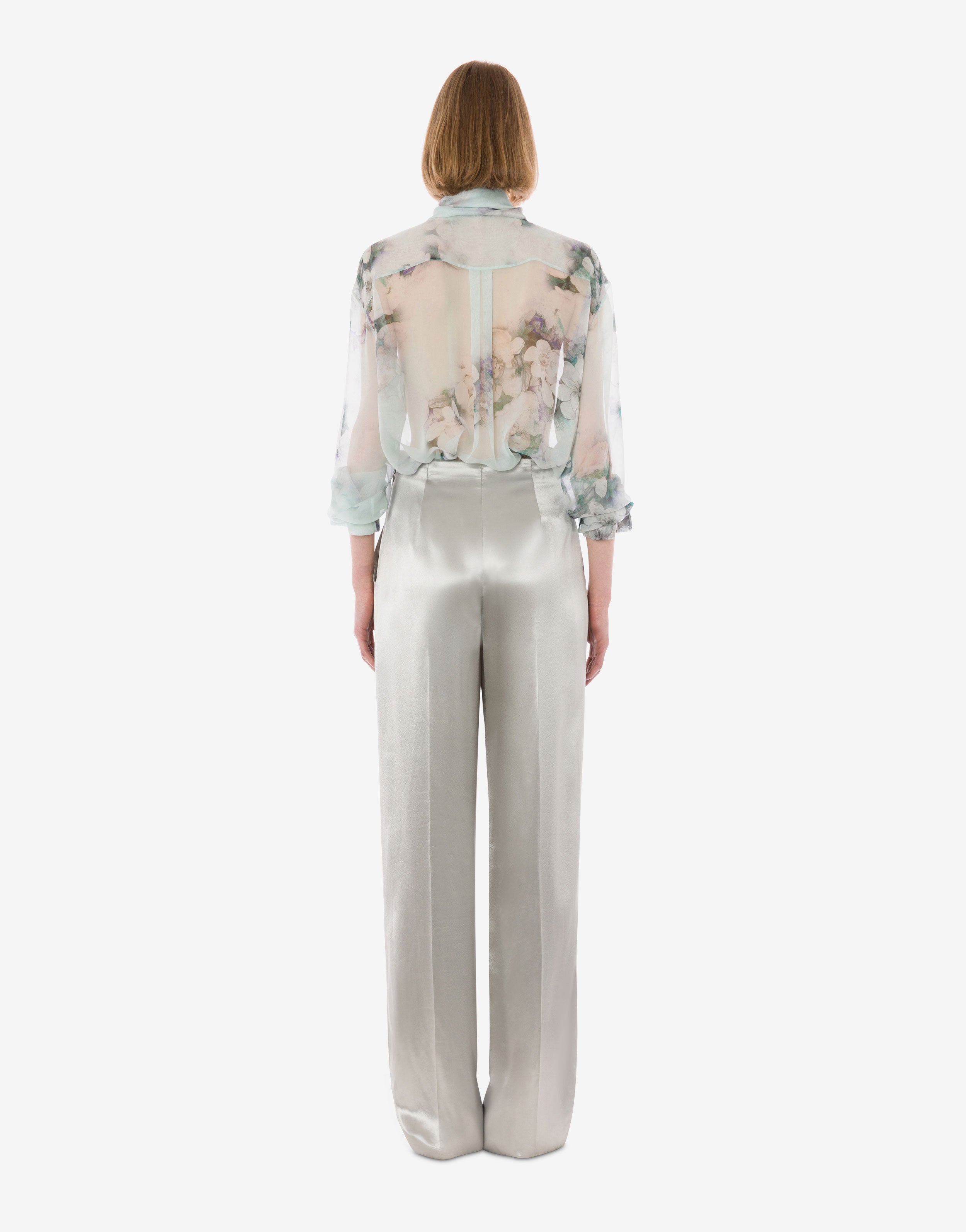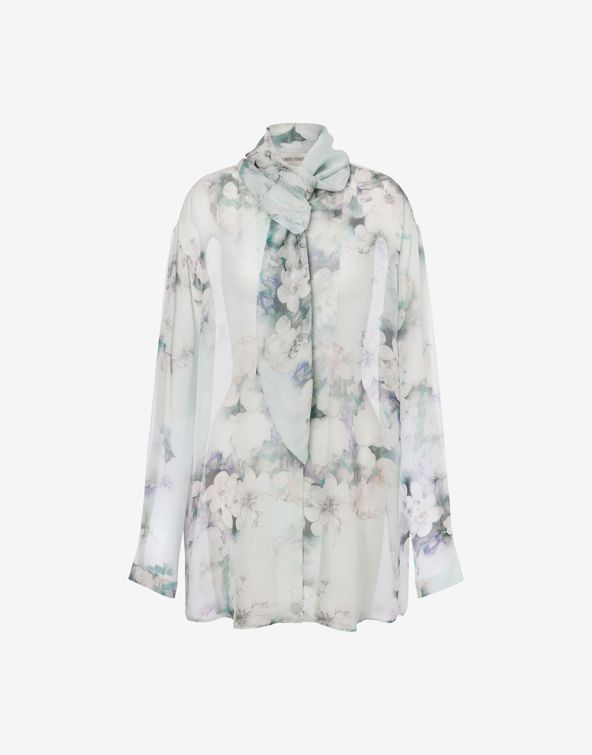 Il chiffon conferisce a questa camicia una qualità velata e ariosa, permettendo al motivo floreale in una palette di tonalità ghiaccio di tracciare dolcemente sulla pelle. Il tessuto extra sulla scollatura aggiunge movimento e può essere annodato elegantemente a cravatta o lasciato drappeggiare lungo la silhouette.