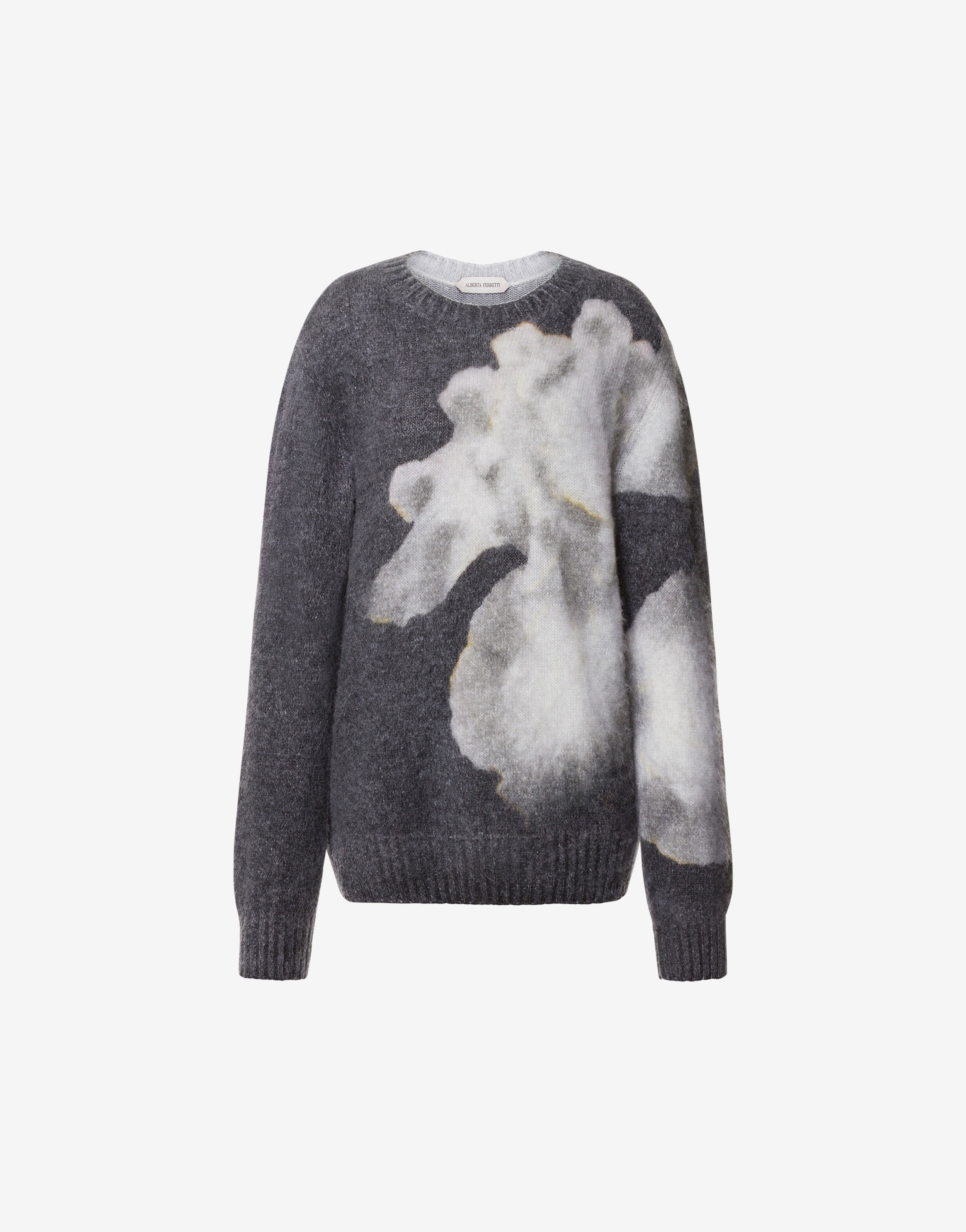 Un momento monocromatico. Il morbido mohair diventa una tela per la stampa di orchidee oversize di questa stagione, che decora il corpo e la manica di questo maglione di lana a maniche lunghe.