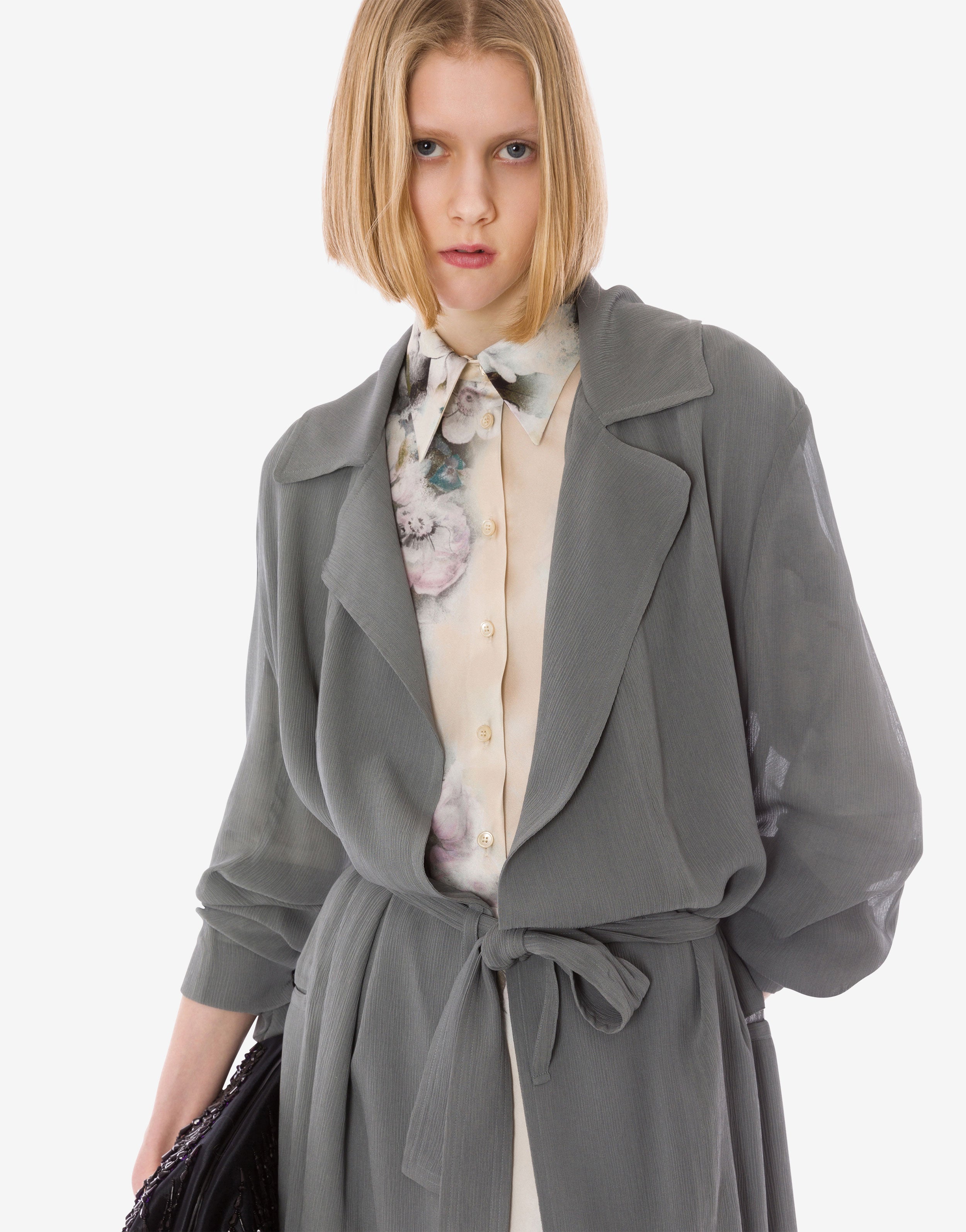 Un trench leggero in creponne di viscosa, tagliato a lunghezza midi. Rifinito con una chiusura a cintura tono su tono per una silhouette snella.
